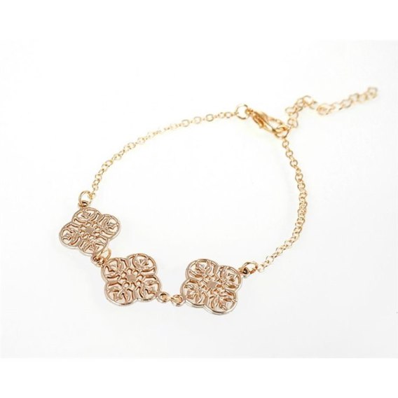 Bransoletka o kształcie ażurowej koniczyny na delikatnym łańcuszku.Bransoletka świetnie pasuje do eleganckich, jak również do codziennych stylizacji.Idealny dodatek do każdego zegarka!Wymiary:długość 19 + 5 cm Bransoletka w kolorze złotym.