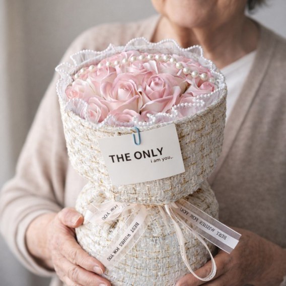 Bukiet kwiatów mydlanych jest umieszczony w ekskluzywnym opakowaniu, ozdobionym subtelnymi zdobieniami i kokardą.